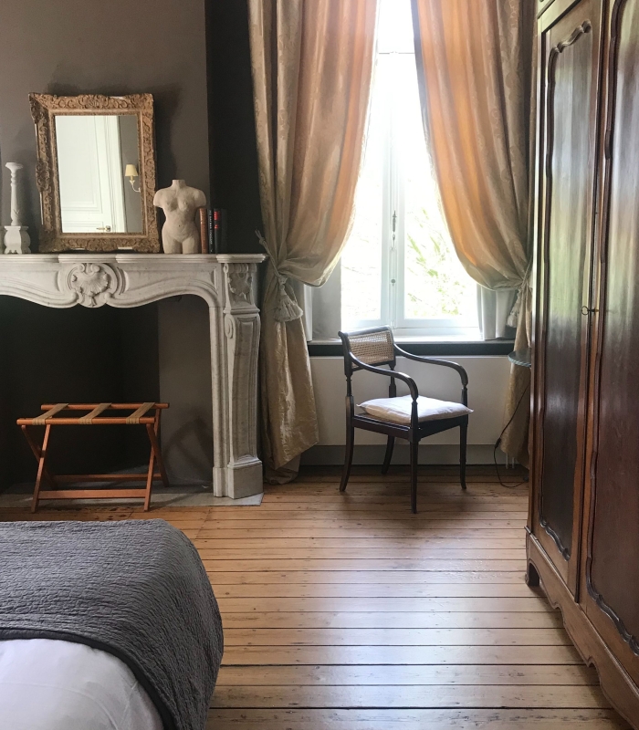 De riante Suite (40 m²) heeft uitzicht op de mooie tuin van het kasteel en het centrum van Veurne, heeft een hoog plafond, parketvloer en sierlijke schouw en is voorzien van 1 tweepersoonsbed, aparte zitruimte, koffie- en theefaciliteiten, kast, verwarming en badkamer met douche, toilet, wastafel, haardroger en gratis toiletartikelen.