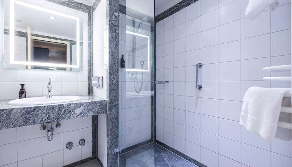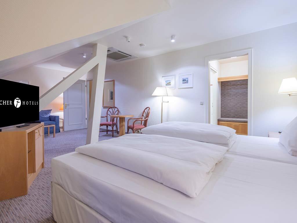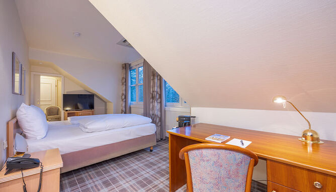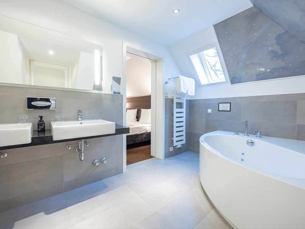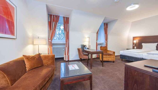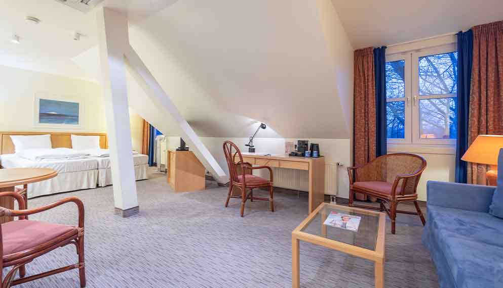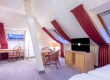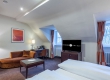 De zeer ruime Suite (60 m2) is voorzien van 1 tweepersoonsbed, bureau, kluis, televisie, wifi, make-up spiegel, slaapbank en badkamer met douche en/of bad, toilet, wastafel en haardroger.
