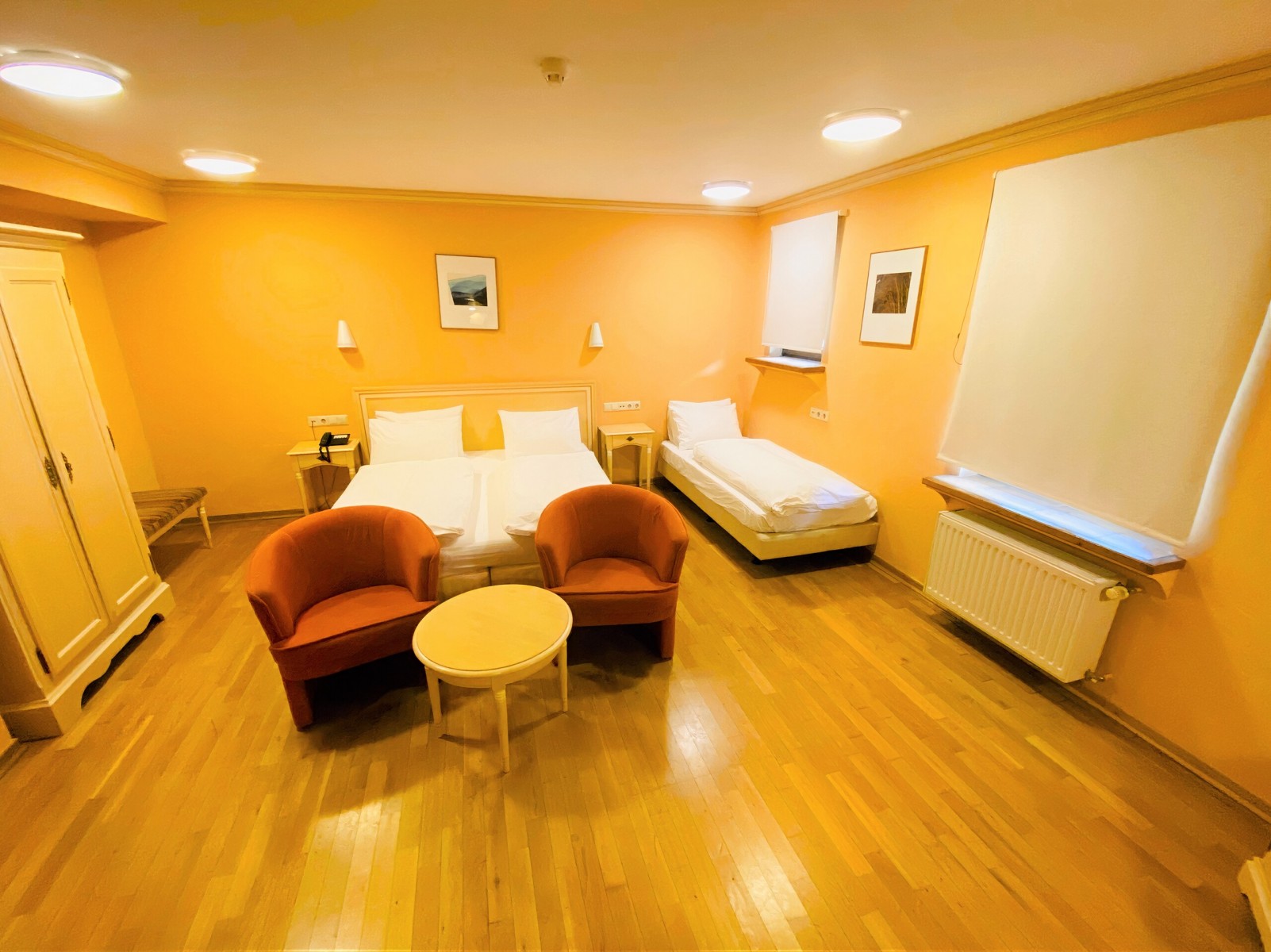 De ruime Familiekamer (30 m²) biedt uitzihct op de rivier en is voorzien van 1 groot tweepersoonsbed en 2 eenpersoonsbedden (2 aparte slaapkamers), zithoek, flatscreen-tv, bureau, koffie- en theefaciliteiten, verwarming, koelkast en badkamer met bad, toilet, wastafel, haardroger en gratis toiletartikelen.