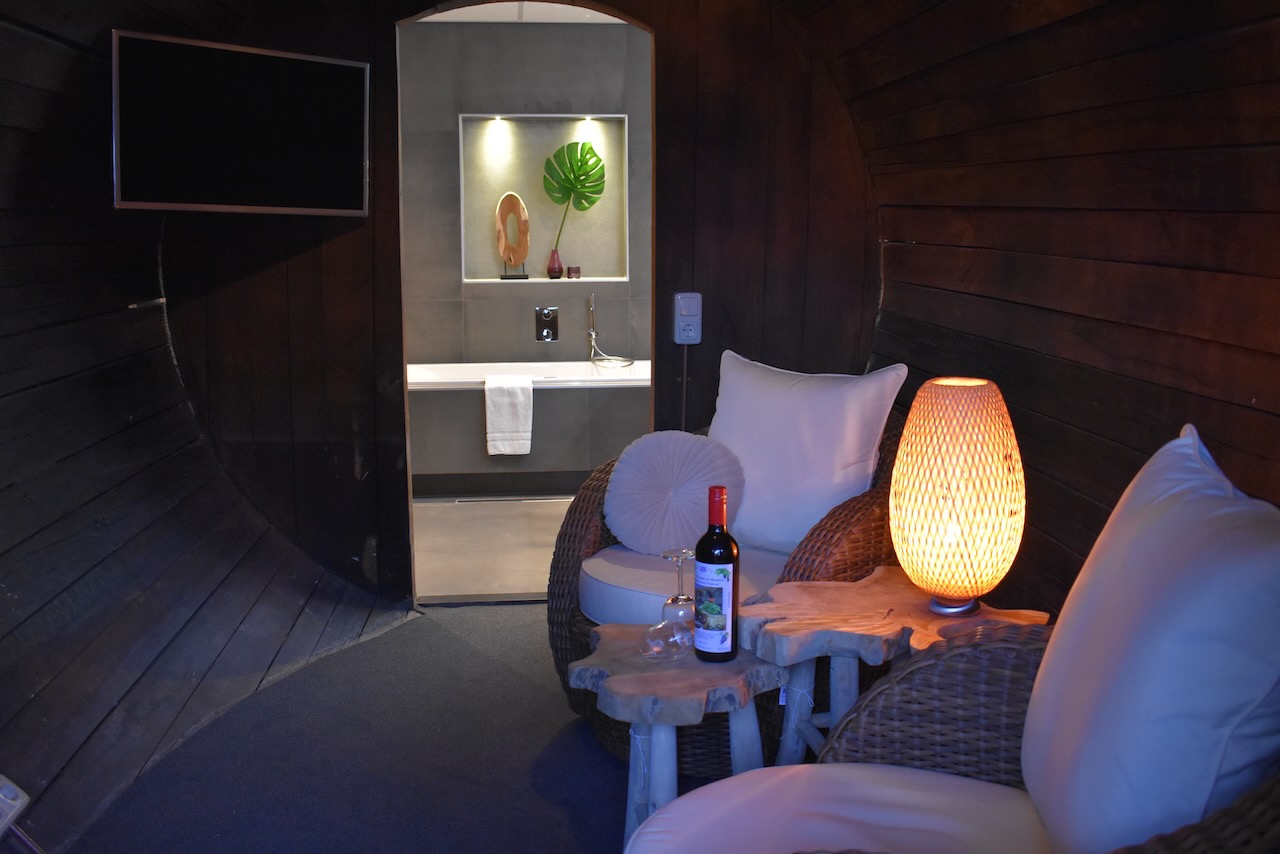 Bij het Wellness Twin Wijnvat met sauna heb je de beschikking over 2 wijnvaten. In het 1e wijnvat bevindt zich een zitje met smart televisie en ingang naar de privé wellnessfaciliteiten en in het 2e wijnvat een tweepersoonsbed. Verder voorzien van sauna, zitje, flesje rode wijn, zitgelegenheid voor de wijnvaten, wifi, vloerverwarming, koffie- en theefaciliteiten, koelkastje en badkamer met whirlpool, douche met sunshower, toilet, wastafel, haardroger en toiletartikelen.