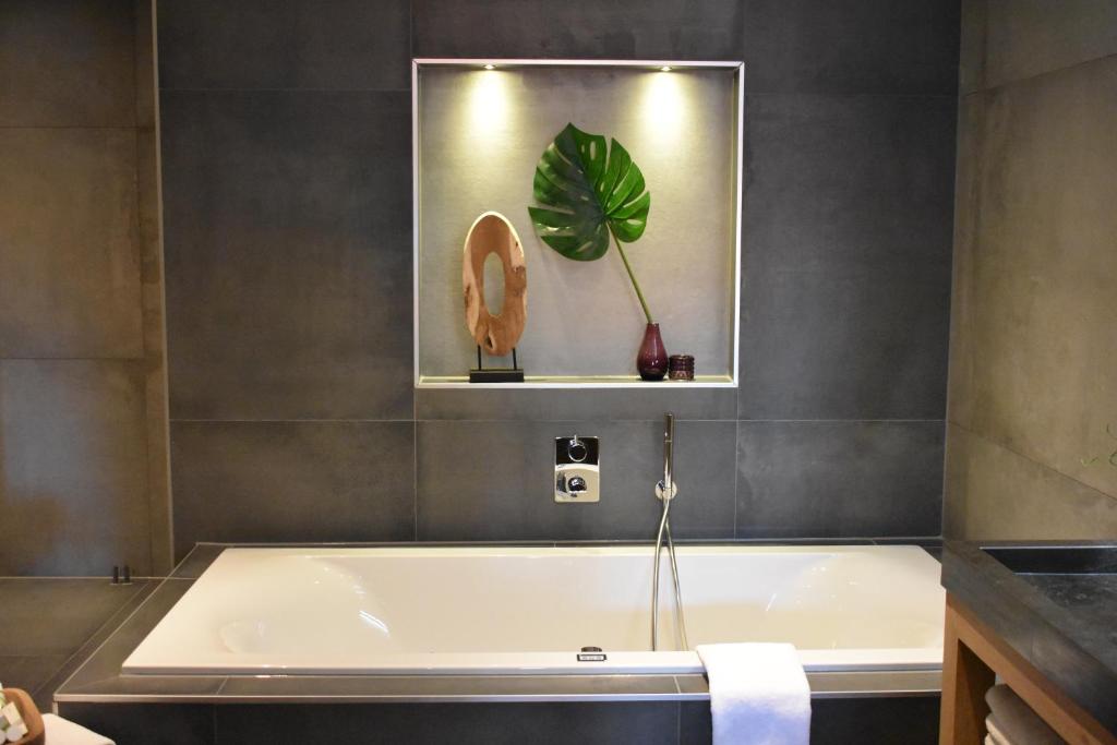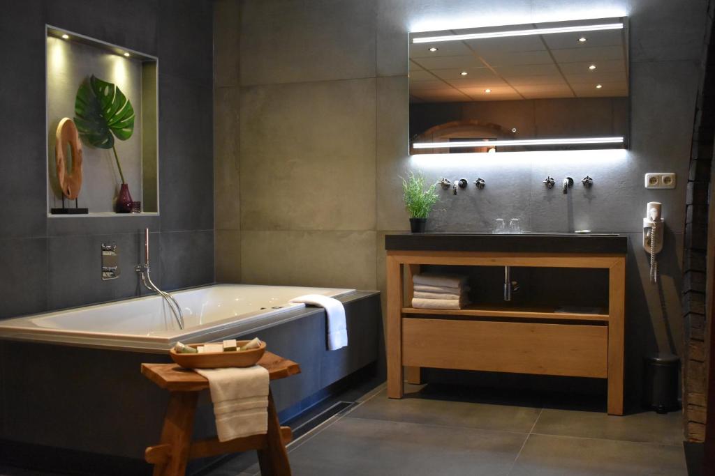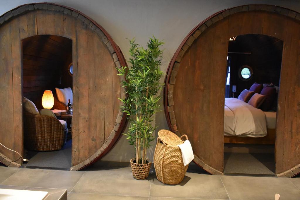Deze Wijnvat - hotelkamer is voorzien van tweepersoonsbed, flesje rode wijn, zitgelegenheid voor de wijnvaten, zitkamer, bureau, comfortabele zitbank, wifi, smart televisie, bureau, koffie- en theefaciliteiten, koelkastje en badkamer met vloerverwarming, ligbad, douche, toilet, wastafel, toiletartikelen en haardroger.