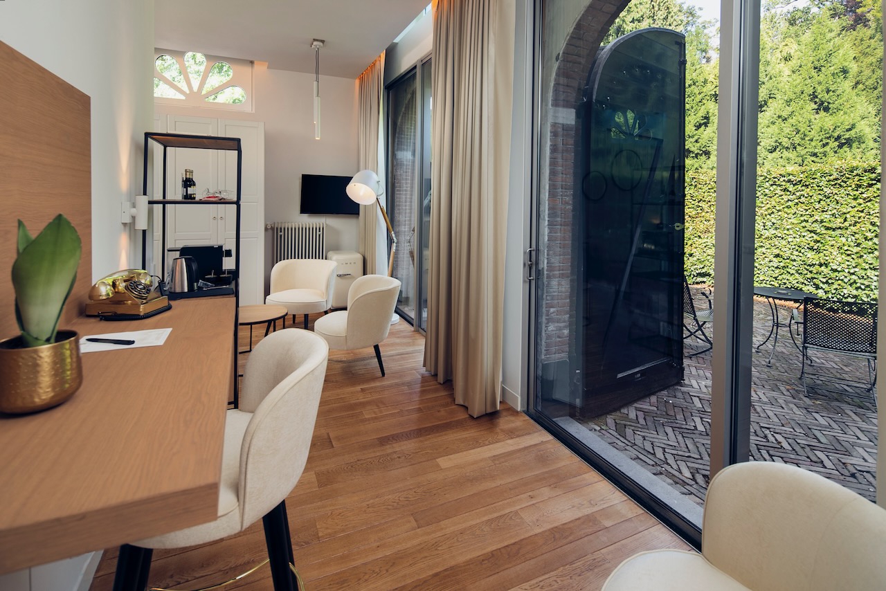 De zeer ruime en elegant ingerichte Junior suites (35 m²) bieden uitzicht op de tuin en zijn voorzien van 1 tweepersoonsbed, zithoek, flatscreen televisie, radio, koffie- en theefaciliteiten, minibar, wifi, kluisje, bureau, verwarming, telefoon, kast en badkamer met bad, douche, toilet, wastafel, haardroger, sloffen en gratis toiletartikelen.