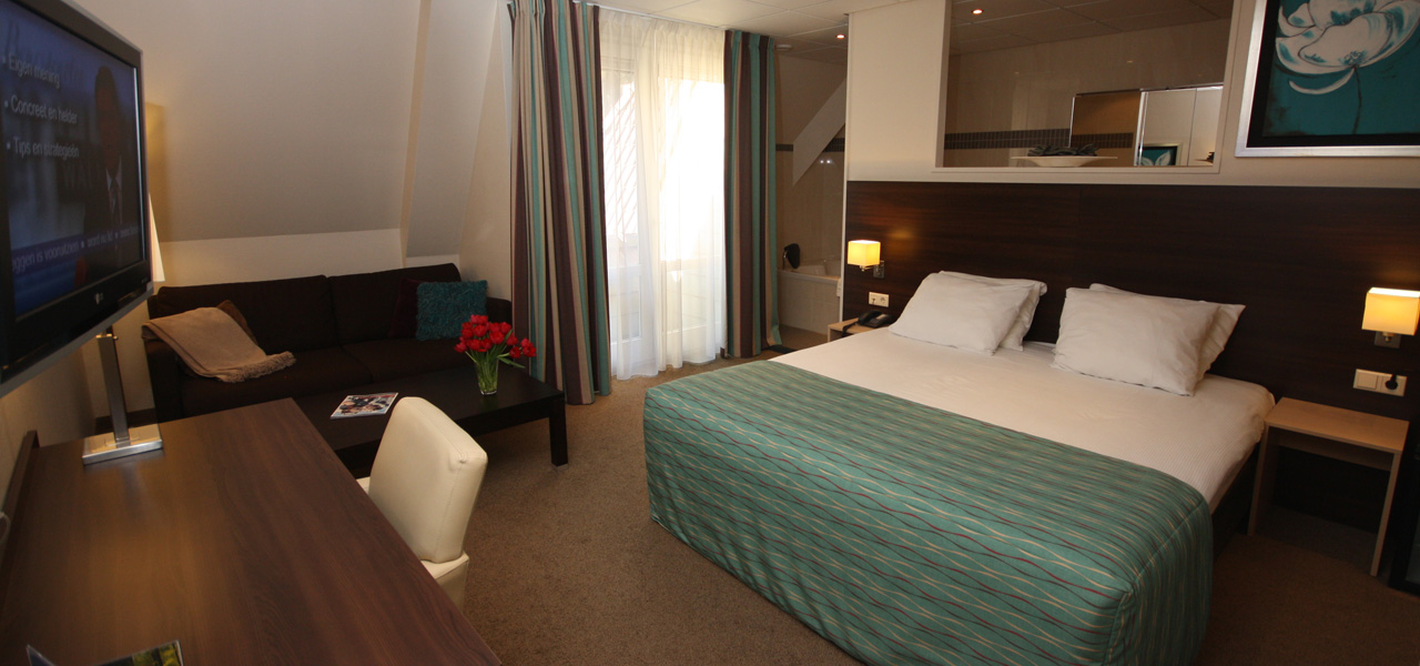 De Suite (ca 25 m²) heeft een klein balkon en is voorzien van een comfortabel king size bed, zithoek met flatscreen tv, koffie- en theefaciliteiten, gratis WiFi, kluisje, telefoon, koelkastje en badkamer met jaccuzzi en ruime douche, toilet en föhn.