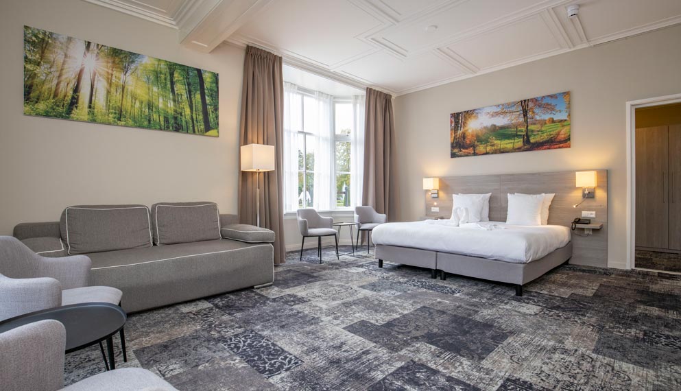 De ruime Familie Suite (30 m2) bevindt zich in het aangrenzende koetshuis en is voorzien van terras, 1 tweepersoonsbed, 2 eenpersoonsbedden, zithoek, bureau, kluis, slaapbank, wifi, televisie, koffie- en theefaciliteiten en badkamer met douche, toilet en wastafel.