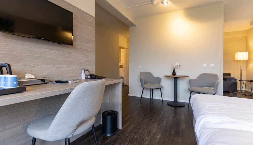 De comfortabel ingerichte Junior suites zijn voorzien van balkon, 2 eenpersoonsbedden, flatscreen televisie, telefoon, wifi, fauteuil, bank, tafel, kast en badkamer met bad, aparte douche, toilet, haardroger en toiletartikelen.