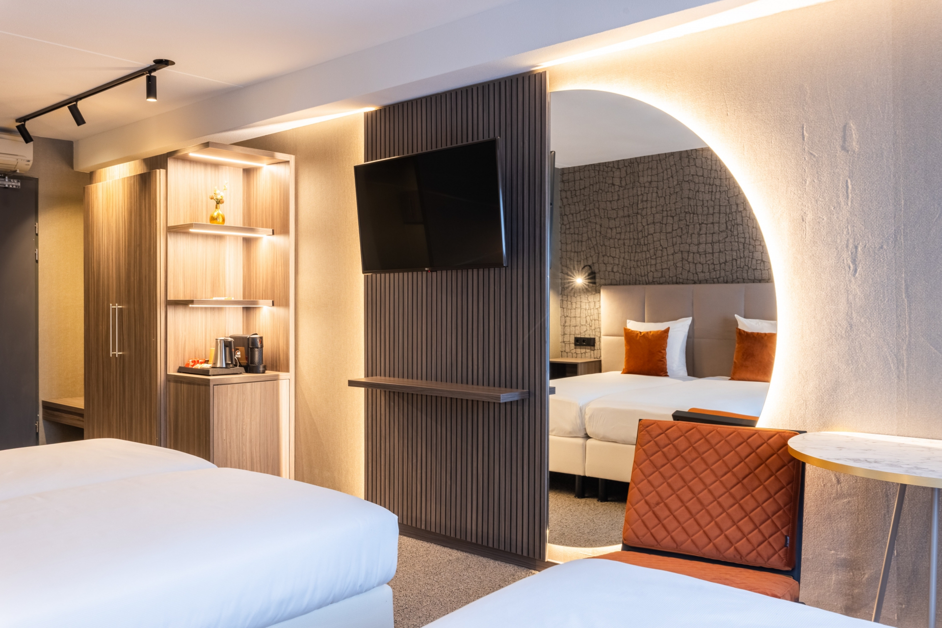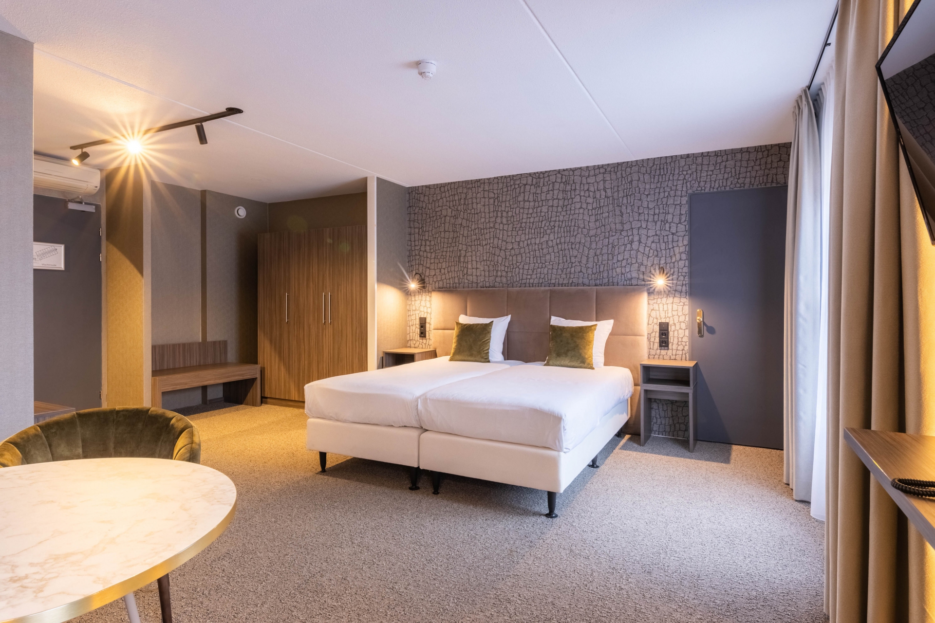 De ruime Junior Suites bieden uitzicht op de omgeving en zijn voorzien van 2 eenpersoonsbedden, Nespresso apparaat, koelkastje met gratis flesjes water, gratis WiFi, telefoon, flatscreen-tv, airconditioning, strijkvoorziening, zithoek, bureau, koffie- en theefaciliteiten, verwarming en luxe badkamer met bad of douche, toilet, haardroger en toiletartikelen.