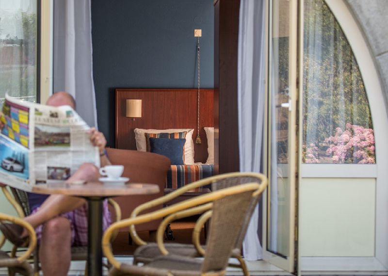 Een ruime kamer met terras. Het afgescheiden woongedeelte is sfeervol ingericht. U kunt lekker lezen, TV kijken of draadloos internetten in de privacy van uw eigen kamer. Er is een eethoekje voor 2 personen en een goed gevulde minibar. De luxe badkamer met ligbad en douche is dé plek voor optimale ontspanning. Voor de liefhebber: geniet van de zon op uw privé-terras, met uitzicht op de tuin.
