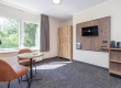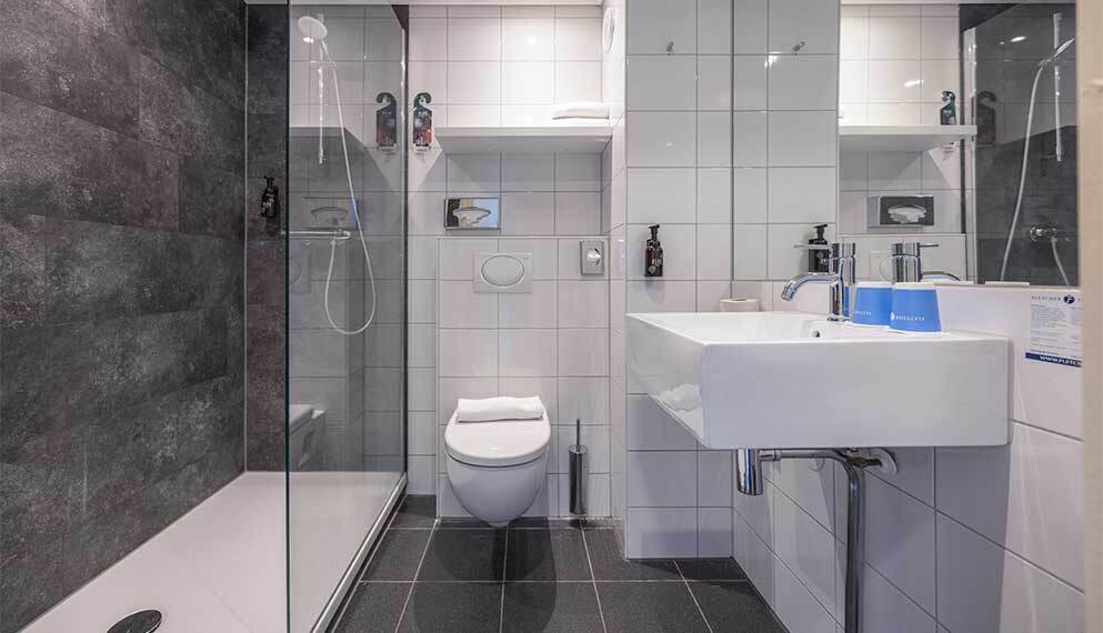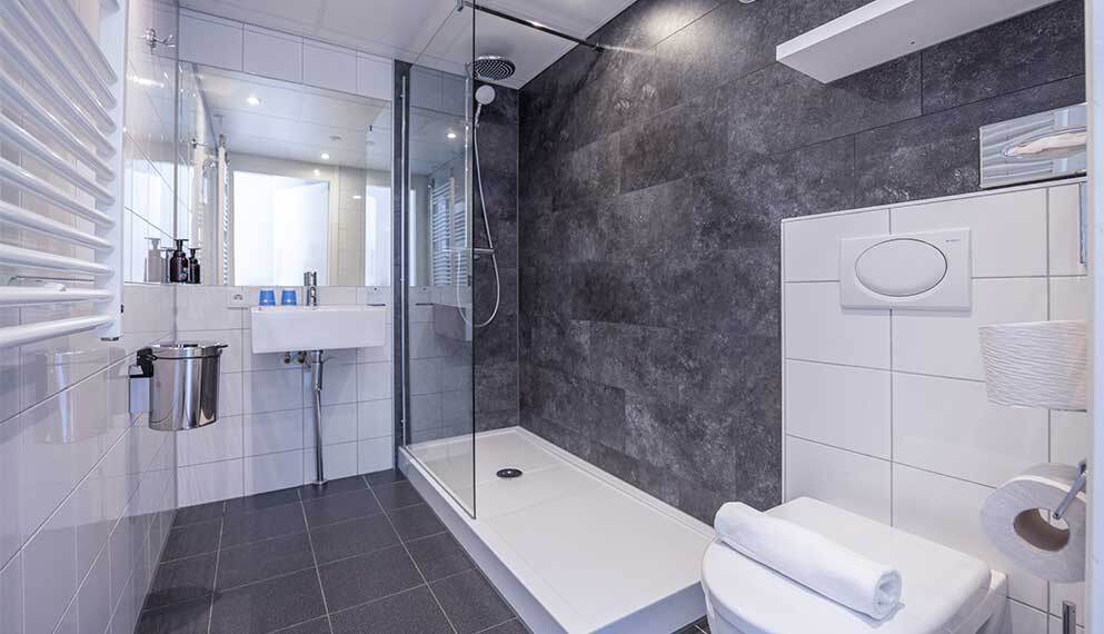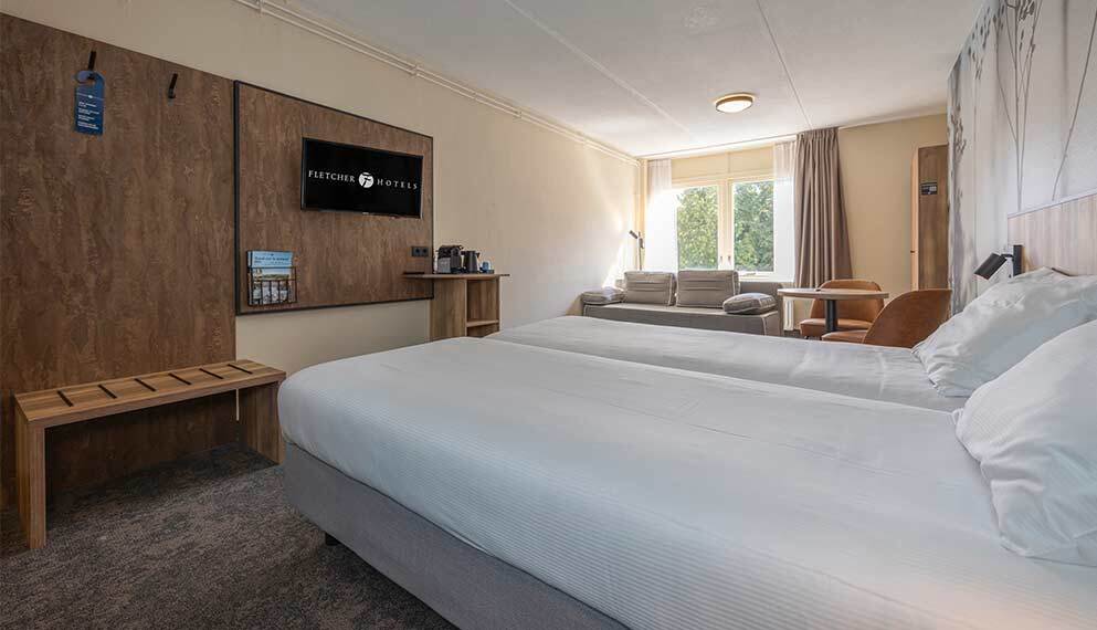 De Familie kamers (20 m2) zijn voorzien van 2 eenpersoonsbedden, slaapbank, televisie, bureau, wifi, kluisje, zithoek, koffie- en theefaciliteiten en badkamer met douche, toilet, wastafel en haardroger.