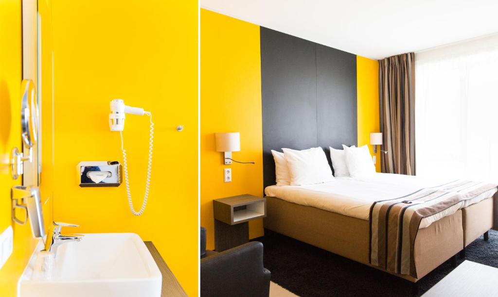 De 101 kamers in het hotel zijn verdeeld over drie verdiepingen, met elk een eigen kleur die verwijst naar een Gouds thema; het wapen en de vlag van Gouda (rood), de kaas (geel) en de bruggen, sluizen en wateren in en om Gouda (blauw).