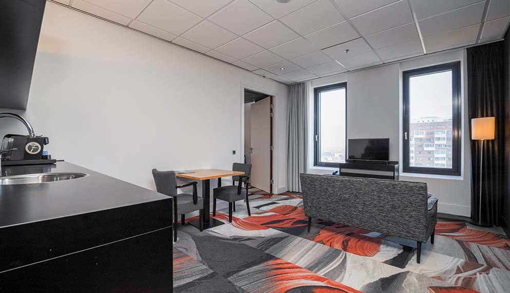 De zeer ruime, modern ingerichte Suites (42 m²) zijn voorzien van 1 kingsize tweepersoons boxspringbed, grote zithoek, flatscreen televisie, gratis WiFi, kluisje, koelkast, bureau, stoelen, koffie- en theefaciliteiten en badkamer met douche, toilet, wastafel, haardroger en toiletartikelen.