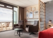 De zeer ruime Executive kamers (32 m²) hebben zeezicht en zijn voorzien van balkon met prachtig uitzicht op het strand en de Noordzee, 1 tweepersoonsbed, flatscreen tv, wifi, bureau, zithoek, kluisje, koelkastje, koffie- en theefaciliteiten, badjas en slippers en badkamer met inloopdouche, toilet, wastafel, haardroger en gratis toiletartikelen (bereikbaar per lift).